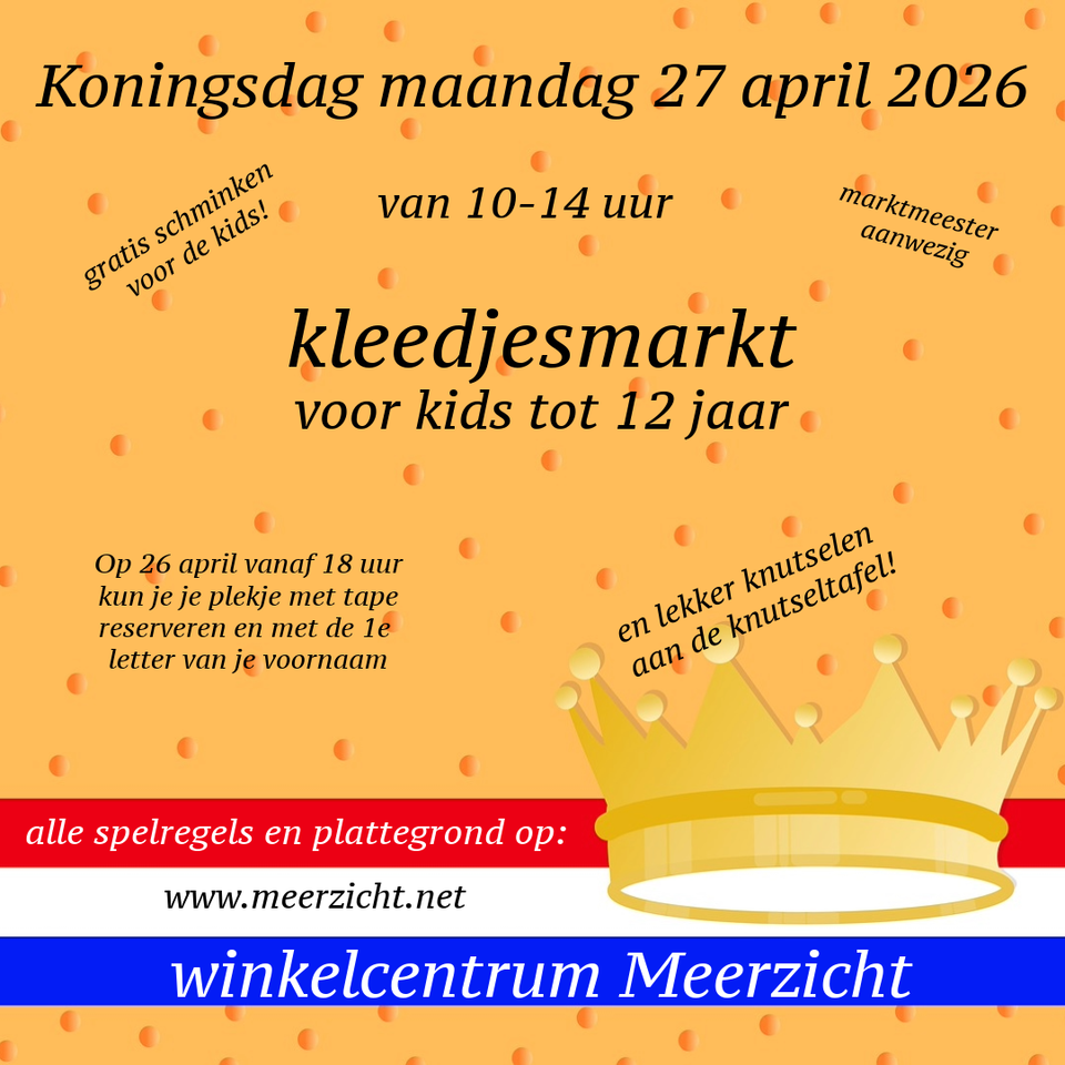 Weer een gezellige kleedjesmarkt met Koningsdag in ons winkelcentrum. Op maandag 27 april 2026 van 10 tot 14 uur kunnen de kids tot 12 jaar hun spullen verkopen. De markt is niet voor professionele verkoop. Tussendoor kunnen de kids zich gratis laten schminken en lekker knutselen aan de welbekende knutseltafel. Gedurende de markt is er een marktmeester aanwezig.