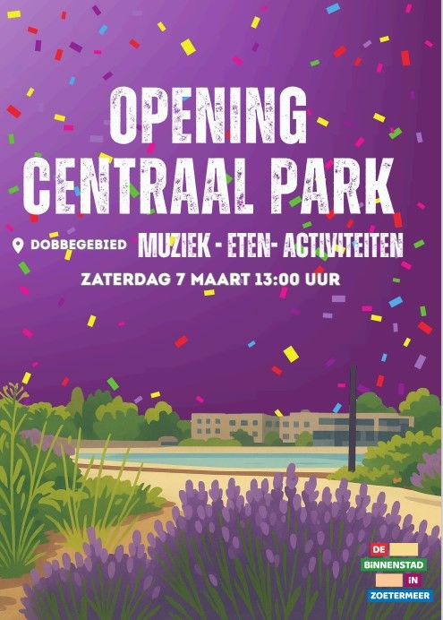 Feestelijke van het heringerichte Centraal Park. De activiteiten zullen plaatsvinden in het Dobbegebied. Op de nieuwe speel- en sporteilanden, jeu de boules bij het Nicolaasplein, muziek, kraampjes en springkussens op de markt. Een feest voor alle Zoetermeerders!