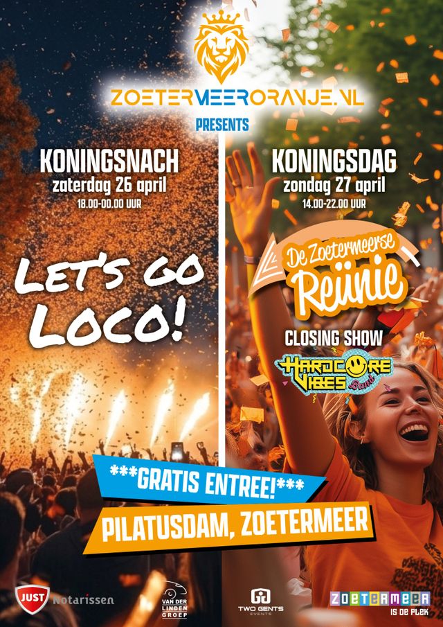 Verwacht twee dagen vol energie, herkenning en gezelligheid. Koningsnacht start met Let’s Go Loco, een feest vol nostalgie met de beste classics en guilty pleasures. Op Koningsdag staat de Zoetermeerse Reünie centraal, waar jong en oud samenkomen voor muziek, live acts en een knallende afsluiting met de band Hardcore Vibes.