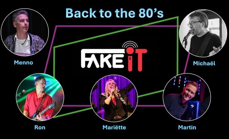 De band bestaat uit Martin (keys), Ron (gitaar & backing vocals), Menno (drums & backing vocals), Michaël (bas & backing vocals) en zangeres Mariëtte als frontvrouw. Met een sterke focus op pop- en rockklassiekers uit de jaren 80, met af en toe een uitstapje naar de 70’s en 90’s, zet Fake It gegarandeerd een feest van herkenning neer. Liefhebbers van het eighties-geluid zitten hier helemaal goed: meezingen is onvermijdelijk! Bereid je voor op hits van onder andere Tears for Fears, Queen, Spandau Ballet, Duran Duran en A‑ha, die het publiek moeiteloos terugbrengen naar de sfeer van de legendarische jaren 80.