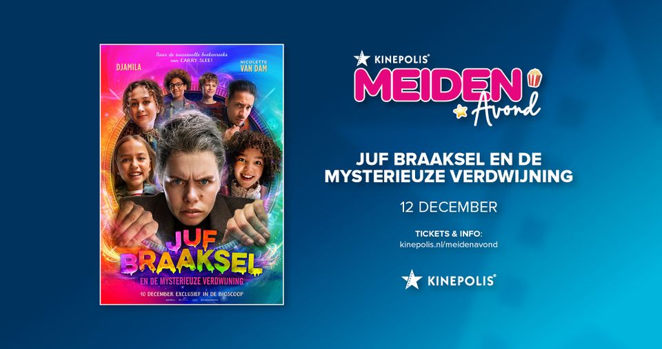 Ben jij gek op film, beauty en lifestyle? Kom dan samen met je vrienden naar de Kinepolis MEIDEN Avond en bekijk Juf Braaksel en de Mysterieuze Verdwijning met toffe extra’s! Je bent welkom vanaf een half uur voorafgaand aan de start van de film.