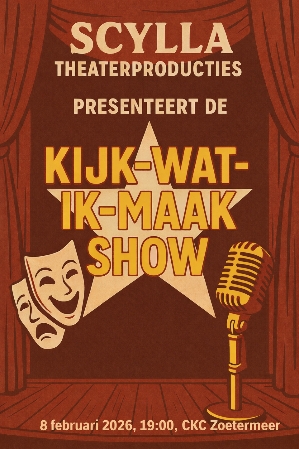 Scylla Theaterproducties presenteert de ‘Kijk-Wat-Ik-Maak-Show’. Een avond waarin de maker centraal staat. Een avond waarin zes totaal verschillende acts te zien zijn. Kortom: een hele gezellige avond!