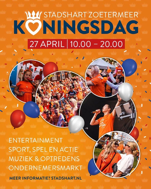 Met een mix van muziek, sport, kinderactiviteiten, entertainment en een gezellige markt is Koningsdag in het Stadshart Zoetermeer dé plek om samen de verjaardag van de koning te vieren. Kom langs, trek iets oranjes aan en vier Koningsdag mee in het Stadshart!