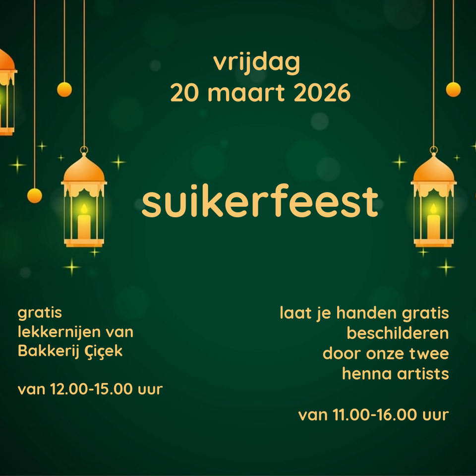 Het einde van de ramadan vieren wij op vrijdag 20 maart. Van 12-15 uur worden er zoete lekkernijen van Bakkerij Ҫiçek uitgedeeld. En van 11-16 uur zijn er twee henna artists aanwezig voor het beschilderen van je handen. Kom je ook?