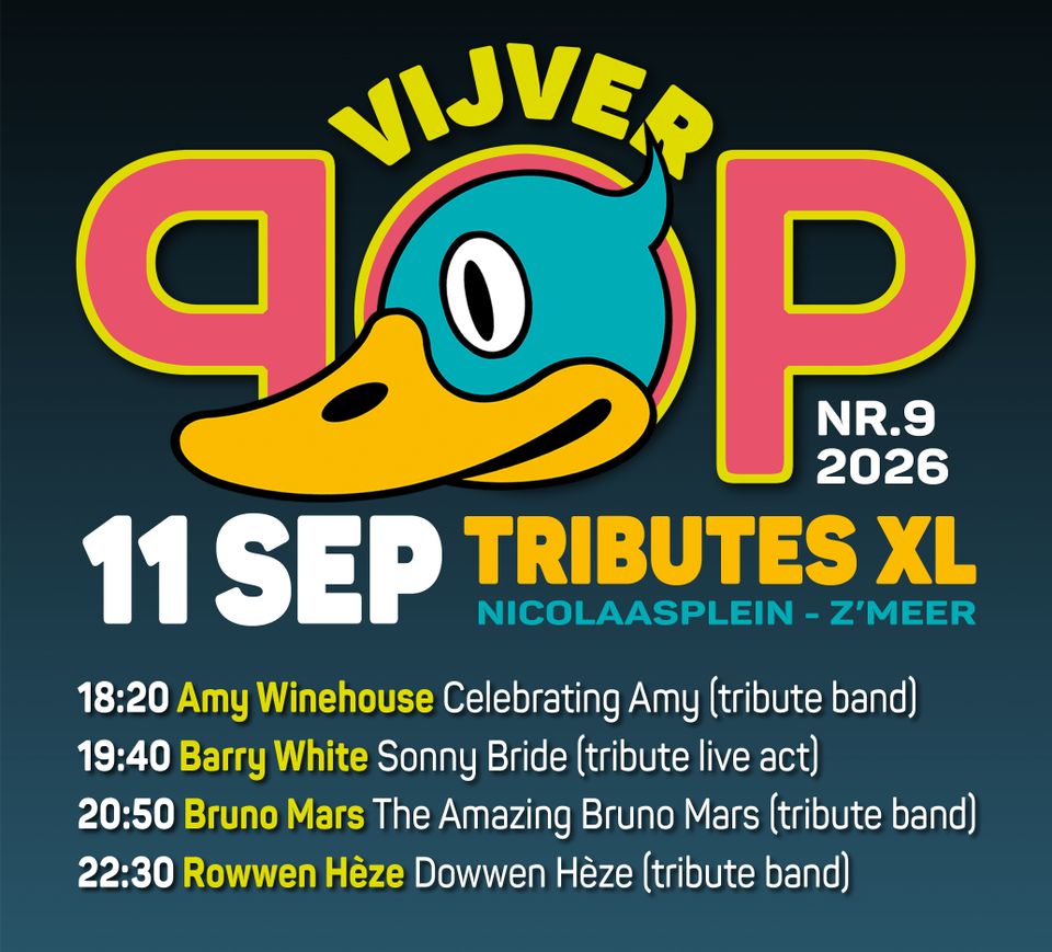 VIJVERPOP TRIBUTES XL is een jaarlijks terugkerend spectaculair muziek-evenement met een flinke dosis entertainment. Beleef twee dagen muziek en plezier met de veelzijdige line-up van top-tribute-acts als Bruno Mars, Miami Sound Machine, Barry White, Kool & the Gang, Rowwèn Heze, Joe Cocker, Nile Rogers & Chic en Amy Winehouse. Zij zullen tijdens deze negende editie van VIJVERPOP TRIBUTES XL de grote pophelden van toen en nu laten (her)beleven! Tijdens de stage-wissels zal DJ NRJ het publiek opzwepen met passende hits. Uiteraard is er een gezellig centraal terras met veelzijdige horeca. Het belooft weer een muzikaal, energiek en kleurrijk feest te worden!