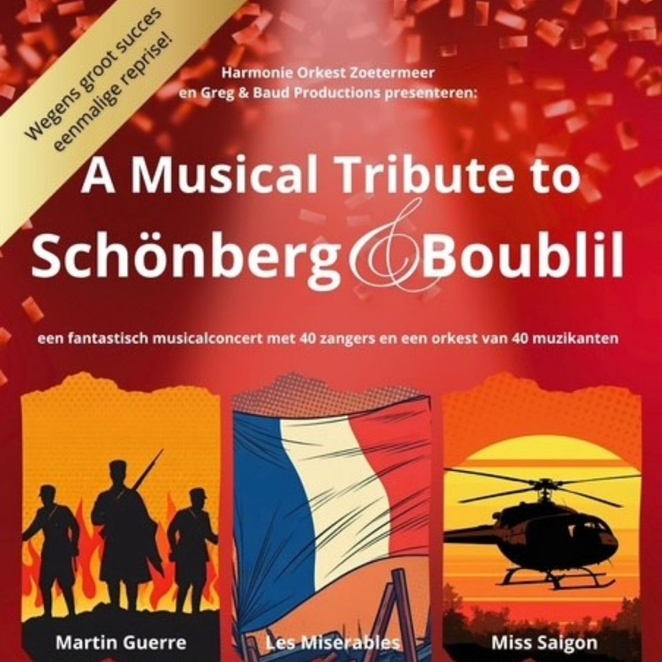 Greg & Baud en Harmonie Orkest Zoetermeer duiken in de meeslepende wereld van Boublil & Schönberg. Van het aangrijpende Martin Guerre tot het iconische Miss Saigon en tijdloze Les Misérables: drie musicals vol strijd, passie en onmogelijke keuzes. Muziek die raakt, verhalen die blijven nazinderen.